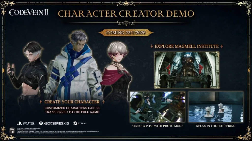 Antes del lanzamiento, los jugadores podrán sumergirse en la demo del creador de personajes de CODE VEIN II a partir del 22 de enero de 2026. Con 64 espacios de guardado que se transfieren directamente al juego final, la demo del creador de personajes permite a los jugadores experimentar el profundo sistema de personalización del protagonista del juego, el cazador de revenants, donde los jugadores pueden personalizar sus personajes a la perfección con una amplia gama de ajustes para el tipo de cuerpo, el peinado, las expresiones faciales, los accesorios, el maquillaje y mucho más. Los jugadores también pueden visitar las aguas termales del Instituto MagMell para ver a su personaje en diferentes entornos de iluminación y utilizar el modo foto para capturar y guardar sus creaciones.