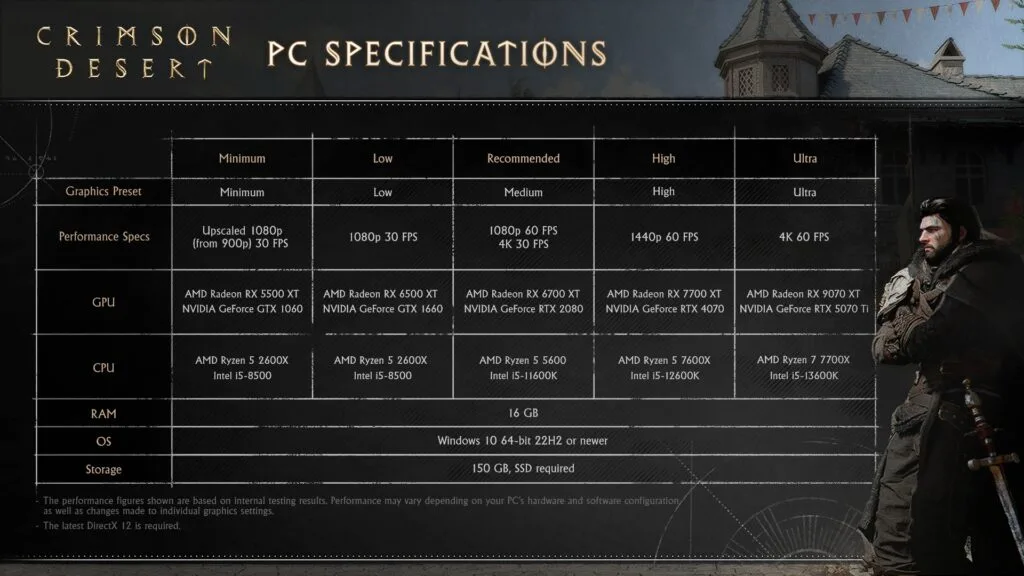 Antes de su lanzamiento mundial el 19 de marzo, Pearl Abyss ha revelado hoy las especificaciones oficiales de rendimiento para PC, consolas y Mac de Crimson Desert, su próximo juego de acción y aventura de mundo abierto ambientado en el vasto continente de Pywel.