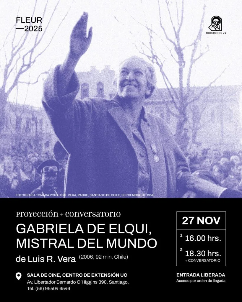 La Pontificia Universidad Católica de Chile, en el marco de FLEUR 2025, anuncia la exhibición especial del documental Gabriela de Elqui, Mistral del Mundo, dirigido por Luis R. Vera y estrenado en 2006.
