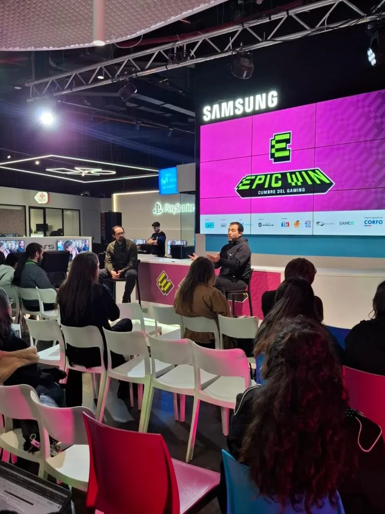 El término de la jornada se dio con otro convestario sobre las opinión sobre la industria del videojuego actual con todas las ponencias que habían expuestos sus presentaciones ese segundo día de la Epic Win. Sentados de izquierda a derecha. Julio Marambio, presidente de la VG Chile; Jose “Hoke” Rojas, fundador de Time Hunters Studio; Max Kübler, vicepresidente de VG Chile y Co fundador de AOne Games; Yves Bordeleau, fundador de Rogue Factor e invitado internacional y el CEO de Movistar Game Club, Mathias Fernández