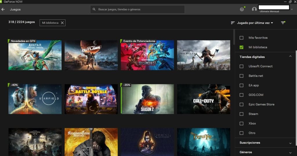 En palabras simples, compras tus juegos en plataformas como Steam, Epic Games Store o usas tu cuenta de Xbox y luego vinculas esas cuentas a GeForce Now para que aquellas bibliotecas digitales, se agregue a la del servicio. Cuando eliges un juego, en vez de ejecutarse en tu computador, se abre en un servidor remoto que tiene hardware de alto nivel y, en el caso de la prueba que pude realizar durante estos 30 días en el plan Ultimate, según la propia Abya, se trata de servidores equipados con tarjetas de video RTX 4080, permitiendo resoluciones de hasta 4K a 120 FPS o 1080p a 240 FPS. GPU que por si no lo sabías, incluye tecnologías de vanguardia como Ray Tracing, DLSS y latencia ultra baja.