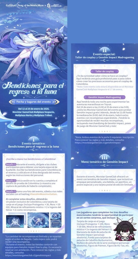 Las actividades se llevarán a cabo en los clubes Movistar GameClub de Santiago y Concepción, específicamente en los clubes de Mallplaza Vespucio, Mallplaza Norte y Mallplaza Trébol. La programación incluirá experiencias vinculadas al juego, premios con mercancía oficial y actividades pensadas para celebrar a la comunidad de Genshin Impact.