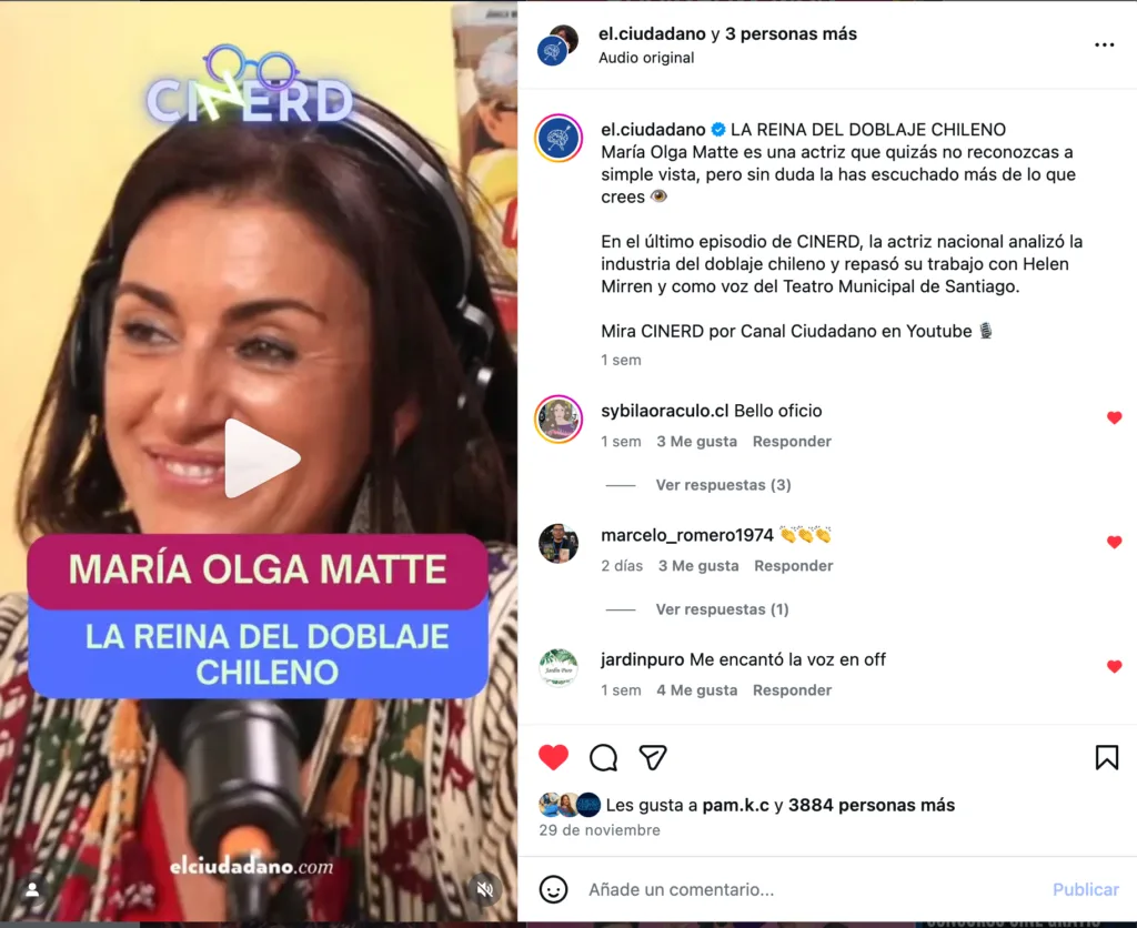 María Olga Matte quizás no sea una actriz que usted no ha visto mucho en teleseries ni en el cine chileno. Pero sin duda sí la ha escuchado. Así es: escuchado. Se podría decir que se trara de La reina del doblaje en Chile, y en una entretenida entrevista con Ernesto Garratt en CiNeRd de Canal Ciudadano, la actriz chilena repasó su sólida trayectoria en el doblaje, ámbito donde ha sido la doble de voz de figuras como Helen Mirren, Margaret Thatcher y un amplio abanico de personajes en series turcas, europeas y producciones documentales