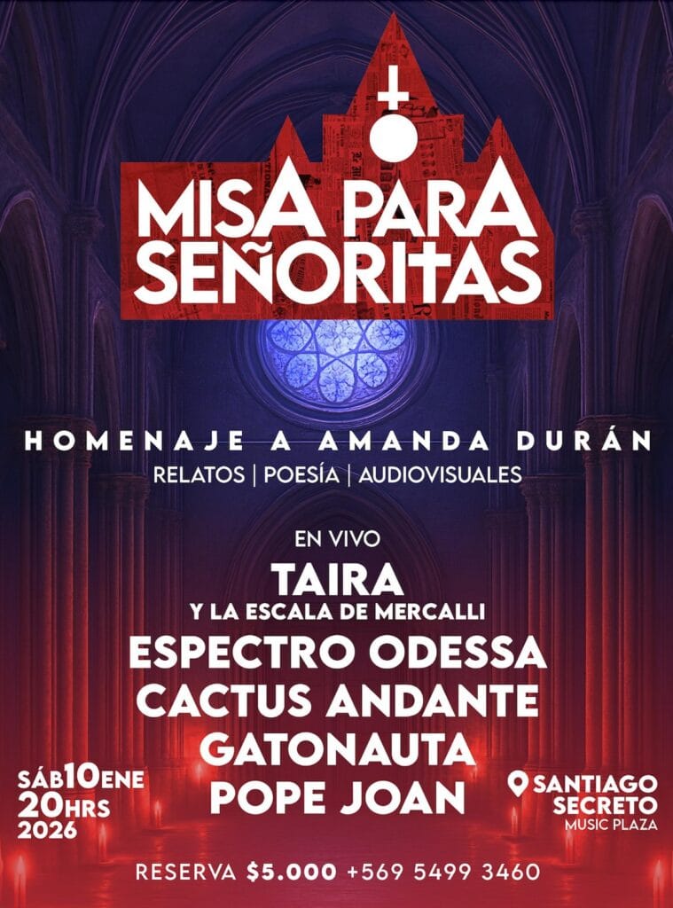 “Misa Para Señoritas” es el nombre de un esperado encuentro cultural que se destaca por la visita de la banda “Taira y La Escala de Mercalli” y que servirá como un sentido homenaje a la aclamada poeta Amanda Durán, quien falleció en junio de 2025.