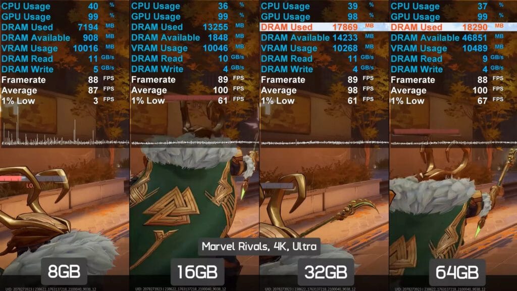 Uno de los hallazgos más reveladores del análisis de TechSpot es la relación simbiótica entre la memoria RAM del sistema y la memoria de video (VRAM) de la tarjeta gráfica. Al probar Marvel Rivals con una tarjeta gráfica de solo 8GB de VRAM (una RX 9060 XT simulada), la situación cambió drásticamente y cuando la VRAM se llena, los activos del juego se desbordan hacia la memoria del sistema (RAM).